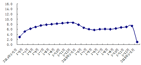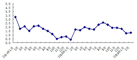 1月-2月,全市居民消费价格总水平比上年同期平均上涨1.3%。其中,食品价格上涨4%,非食品价格上涨0.7%;消费品价格上涨0.4%,服务项目价格上涨2.5%。2月份,全市居民消费价格总水平同比上涨1.3%。