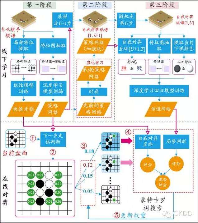 图1、AlphaGo 的原理图 (作者为本图花费大量心血,版权归两位作者所有,欢迎转发,但请勿盗图)