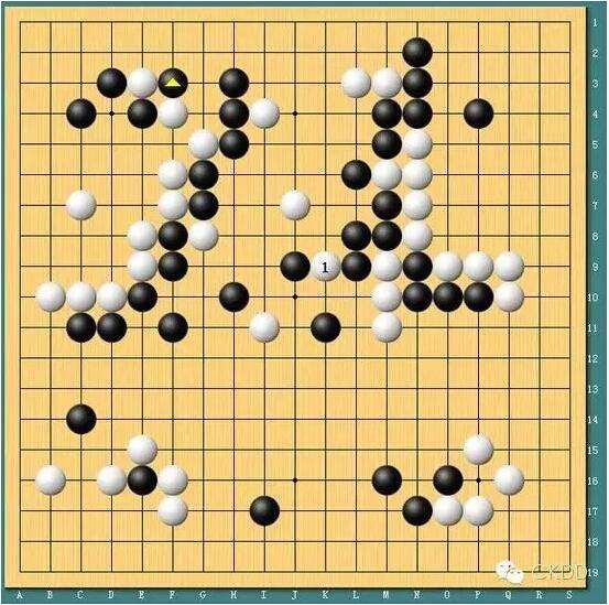 1. 攻其策略网络,加大搜索空间。进入中盘后,职业选手如能建立起比较复杂的局面,每一步棋都牵连很多个局部棋的命运(避免单块、局部作战),则 AlphaGo 需要搜索空间则急剧加大,短时间内得到的解的精度就会大打折扣。李世石九段的第四局棋就有这个意思。此处左右上下共 5 块黑白棋都相互关联到一起,白 1 下后,黑棋需要考虑很多地方。很多地方都需要在 MCTS 上进行跟深入的搜索。为了在一定的时间内有结果,只能放弃搜索精度。
