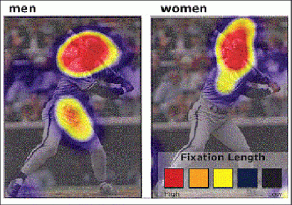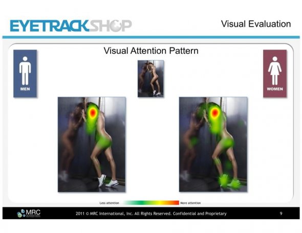 对面走过一个美女,你会先看哪里?据说按照脸蛋->胸->腰->腿的顺序从上往下看的是1x岁的骚年,而按照脚->小腿->大腿->腰->胸->脸蛋的顺序从下往上看的是3x岁的大叔,用恶狠狠的眼神盯着你看哪里的是你的女盆友…开个玩笑,还是让眼球追踪(Eye-Tracking)技术得出的热图来告诉我们什么样的东西最能吸引你的视线吧。