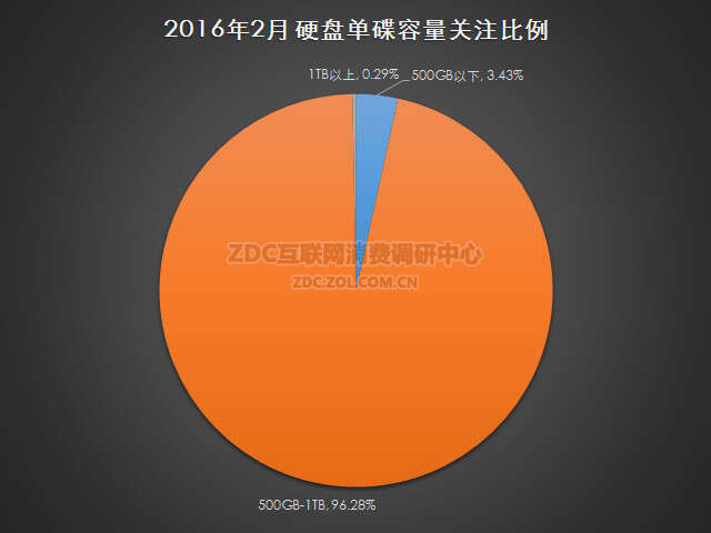 在单碟容量方面,2016年2月中国的硬盘市场上,单碟容量为500GB-1TB范围内的产品最受消费者青睐,其市场关注比例高达96.28%;单碟容量500GB以下及1TB以上的产品市场关注度占比分别是3.43%和0.29%。
