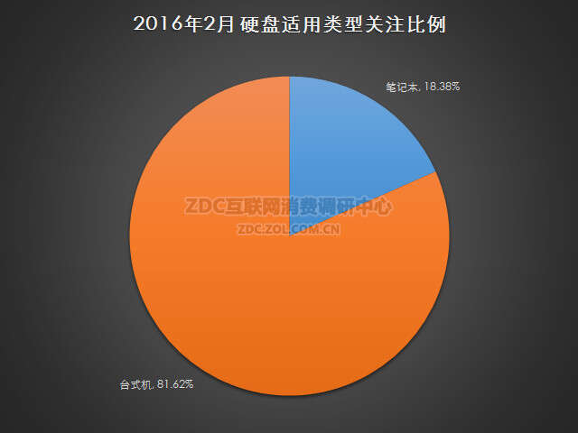 在硬盘的适用类型方面,2016年2月中国的硬盘市场上,台式机硬盘吸引了超过八成的市场关注比例,为目前的绝对主流,笔记本电脑硬盘的市场关注比例只有18.38%。