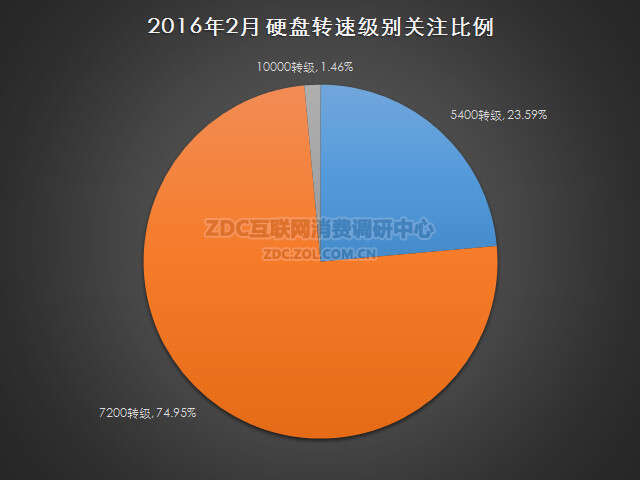 在硬盘的转速级别方面,2016年2月中国的硬盘市场上,7200转级的产品市场关注比例为74.95%,为目前的主流;5400转级的硬盘市场关注比例为23.59%,10000转级的产品市场关注度占比为1.46%。