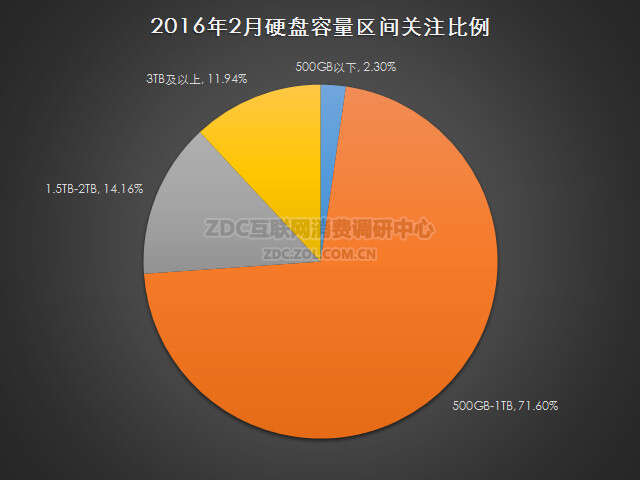 在硬盘的容量区间方面,2016年2月中国的硬盘市场上,容量是500GB-1TB的产品最受用户青睐,吸引了超过七成的市场关注比例;其次是1.5TB-2TB的产品,市场关注比例为14.16;容量为3TB及以上和500GB及以下的产品市场关注度占比分别是11.94%和2.30%。