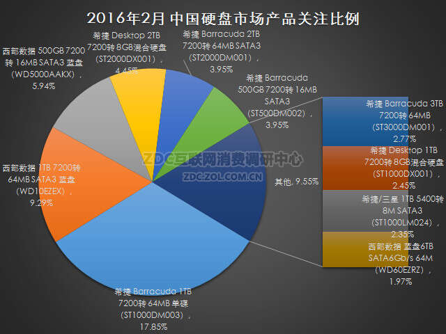 2016年2月中国的硬盘市场上,希捷和西部数据吸引了绝大多数的市场关注度并包揽了全部十大热门产品,台式机硬盘关注度高;价格方面,300元以下的硬盘产品最受消费者青睐,近八成用户关注3.5英寸硬盘;缓存容量方面,64MB缓存的产品为目前市场的主流;单碟容量500GB-1TB的产品市场关注比例超过了九成。
