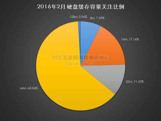 在硬盘的缓存容量方面,2016年2月中国的硬盘市场上,缓存容量为64MB的硬盘市场关注比例为63.06%,最受消费者的欢迎;其次是缓存容量为16MB和32MB的硬盘,市场关注比例分别为17.16%和11.42%;缓存容量为8MB的硬盘市场关注比例为7.39%,缓存容量为128MB的硬盘市场关注度占比为0.96%。