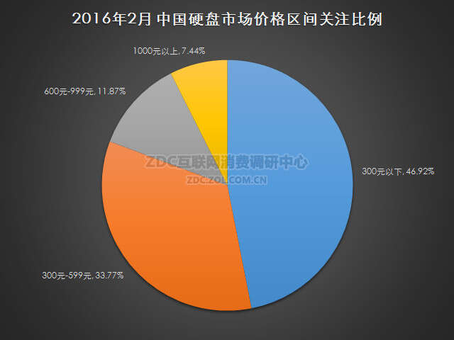 在价格方面,2016年2月中国的硬盘市场上,中低价硬盘产品更受消费者的青睐。其中,价格在300元以下的产品市场关注比例为46.92%,300元-599元的产品市场关注比例为33.77%,价格在600元-999元的产品市场关注比例为11.87%,价格在1000元以上的产品市场关注比例为7.44%。