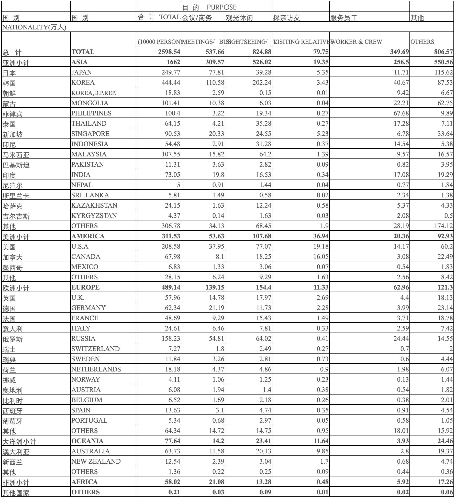 国家旅游局:2015年1-12月入境外国游客人数(按目的分) 更多阅读:国家旅游局:2015年1-12月入境外国游客人数(按年龄、性别分)印度旅游部:2019年印度旅游统计数据旅游营销人员如何善用“小数据”?MMGY:调查显示新千禧一代今年对独自旅行更感兴趣2015-2016中国户外旅行用户行为分析eMarketer:移动增加公司商务出行管理挑战文化和旅游部:2022年第四季度全国旅行社统计调查YouGov:51%的美国人明年有旅行计划文化和旅游部:2021年第一季度全国星级饭店统计调查国家旅游局:2016年2月主要旅游客源市场情况国家旅游局:预计2018年春节假日期间国内旅游市场达3.85亿人次 旅游收入4760亿元国家旅游局:2014年10月1日“十一”旅游市场数据信息国家旅游局:2014年10月3日“十一”旅游市场数据信息国家旅游局:2017年10月2日国庆节共接待国内游客1.14亿人次 同比增长9.9%国家旅游局:2015年10月主要旅游客源市场情况