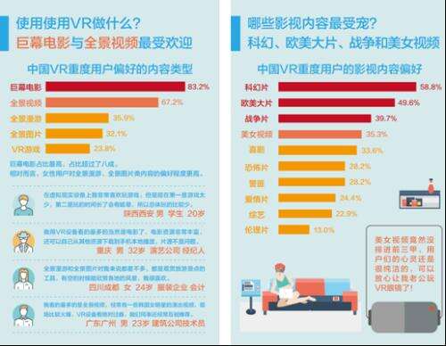 数据还揭示了最受重度用户欢迎的VR影视内容,科幻片、欧美大片、战争片和美女视频位居前列,可以看出,VR用户偏好感官冲击力比较强的VR内容。