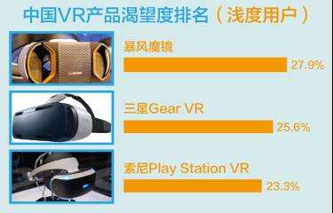 对于浅度用户而言,本土的创新产品无疑成为他们最为关注的,暴风魔镜作为国内VR领域最具影响力的科技产品,在用户的渴望度和内容丰富度上都被给予高度期望。数据显示,浅度VR用户最渴望购买的VR产品分别是暴风魔镜、三星Gear VR、索尼 PlayStation VR ,占比分别为27.9%、25.6%、23.3%。