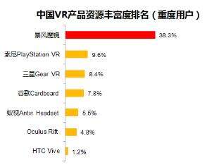 当下内容丰富性也决定着VR产品的使用粘性,数据显示,重度VR用户认为暴风魔镜在资源丰富度上当居榜首,索尼PlayStation VR和三星Gear VR次之,占比分别为38.3%、9.6%、8.4%。