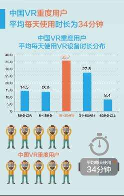 同时,报告显示,超过7成的VR重度用户几乎每天都使用VR设备,而有21%的VR重度用户,会每周使用三次以上VR设备。重度用户每天使用VR设备的时长主要集中在16分钟-60分钟,平均每天使用时长是34分钟,VR已成为重度用户娱乐生活的重要组成部分。
