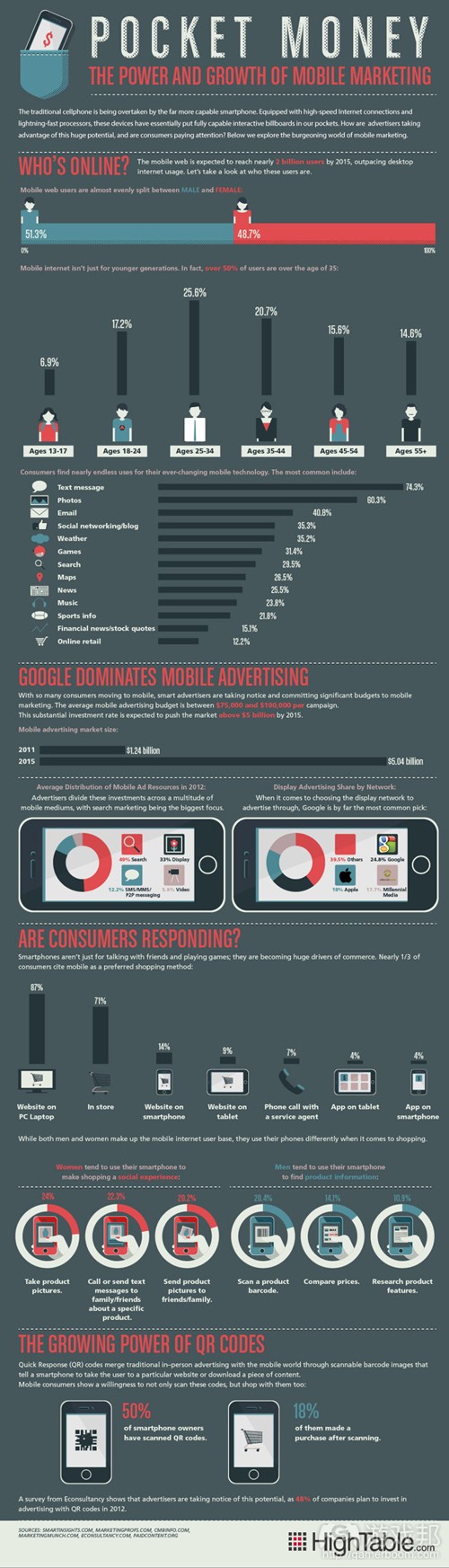 HighTable:美国男性智能手机用户的移动网络使用率高于女性用户 社交初创公司HighTable日前发布的信息图表指出,美国男性智能手机用户的移动网络使用率高于女性用户,两者所占比例分别为51.3%和48.7%。 在各年龄段用户中,25-34岁群体的移动网络使用率最高,达到25.6%,其次是35-44岁群体,所占比例为20.7%。 用户对短信功能的使用率为74.3%,社交网络的使用率为35.2%,玩游戏的比例为31.4%。 更多阅读:Nielsen:2012年移动网络使用率上升82%MediaPost:预计2020年移动互联网设备将占全球人口总数的50%Nielsen:移动互联网上的“两性之战”HighTable:手机市场消费力量和增长趋势解读eMarketer:在巴西,将近1/4的旅游产品会在网上销售从数据看移动市场的增长–数据信息图Online Psychology Degree :调查显示在18-29岁人群中有近90%的人会与智能手机睡在一起年轻人和为人父母人群使用智能手机的差异–数据信息图Strategy Analytics:2021年Q2全球智能手机出货量同比增长11%,达到3.142亿部IDC:2021年第二季度全球智能手机出货量3.13亿部 增长13.2%Strategy Analytics:2021年Q1全球智能手机批发总收入超过1000亿美元[x]cube实验室:用户是如何使用智能手机和移动应用的【数据信息图】洞察 :移动广告的状态【手机改变学生时代–数据信息图】66%用户表示不能生活在没有智能手机的日子里–信息图