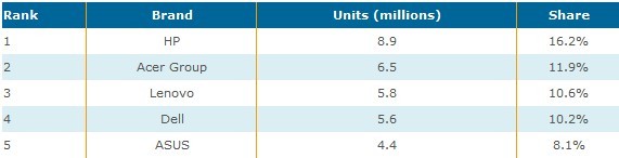 笔记本电脑和迷你笔记本电脑市场上,多数一线品牌都对出货量采取保守态势,选择专注于提高利润而不是扩大市场份额。惠普是少数几家出货量同比增 加的一线厂商之一,增加近70万台。惠普以16.2%的份额维持了笔记本电脑和迷你笔记本电脑排行第一的位置,但在欧洲、中东和非洲市场出货量同比下滑 17%。宏碁占据11.9%的份额,出货量为650万台。尽管该季度中国市场是宏碁的关键区域,但在中国市场出货量大增中受益最大的是联想。联想在北美市 场的份额也有所扩大,而戴尔因为急需专注企业细分市场,丧失了一些份额。在所有一线品牌中,宏碁扩张最为迅猛,在所有区域的市场份额都增加了。