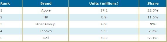 平板电脑促进了苹果移动PC的增长,总份额占到22.5%,是惠普的两倍。排行前五的其他品牌则依赖笔记本电脑的出货量维持其地位。