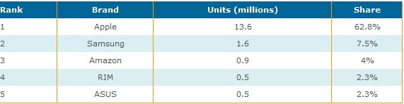 苹果仍然统领平板电脑市场,今年第一季度市场份额为62.8%。Barnes&Noble跌出前五位。亚马逊从第二位降至第三位。三星凭借在欧洲、中东和非洲市场的强劲业绩,重新杀回第二位。RIM和华硕则在上一季度的疲软表现后重返前五位。