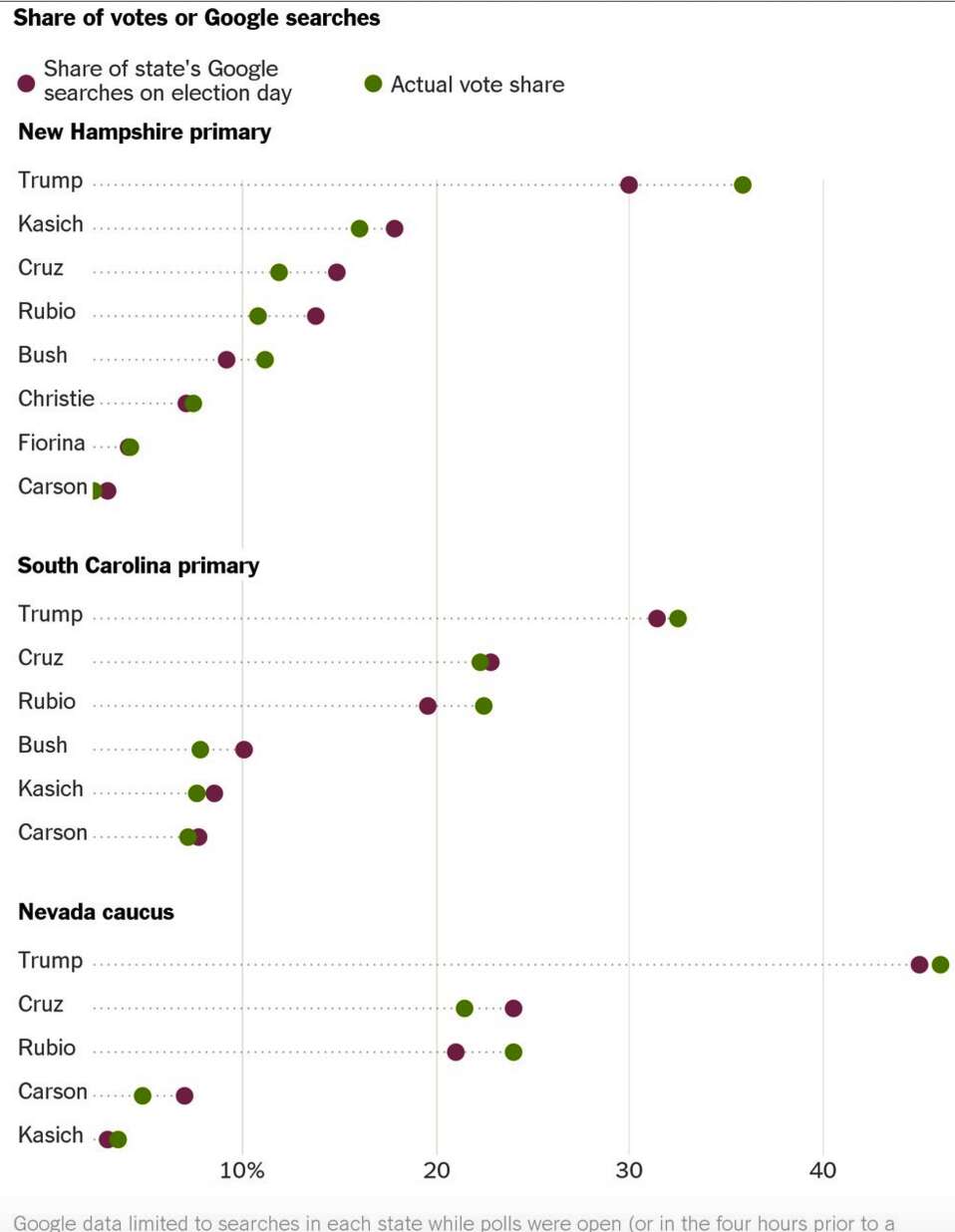 他认为,相对于传统民意调查而言,大众媒体比如推特,拥有着很多优势:它们速度快,能实时反映出人们的兴趣动向。对于运营大众媒体的公司来说,它们也愿意将数据与大众共享。“选举给大众媒体提供了一个高端平台,展示了它们不仅仅只是私人公司,而且是能够为公众服务的形象。它们似乎愿意成为某种基础架构,将竞选者与选民联系起来,让投票者更多地了解候选人,从而帮助他们进行竞选。在选举进程中,这些确实是基础性的重要角色,大众媒体公司愿意成为民主的基石。”但是,他强调搜索强度有时候也会发生偏差,比如某一候选人出现丑闻,相关的搜索和谈论也会急剧上升,但并不意味着支持度也会上升。