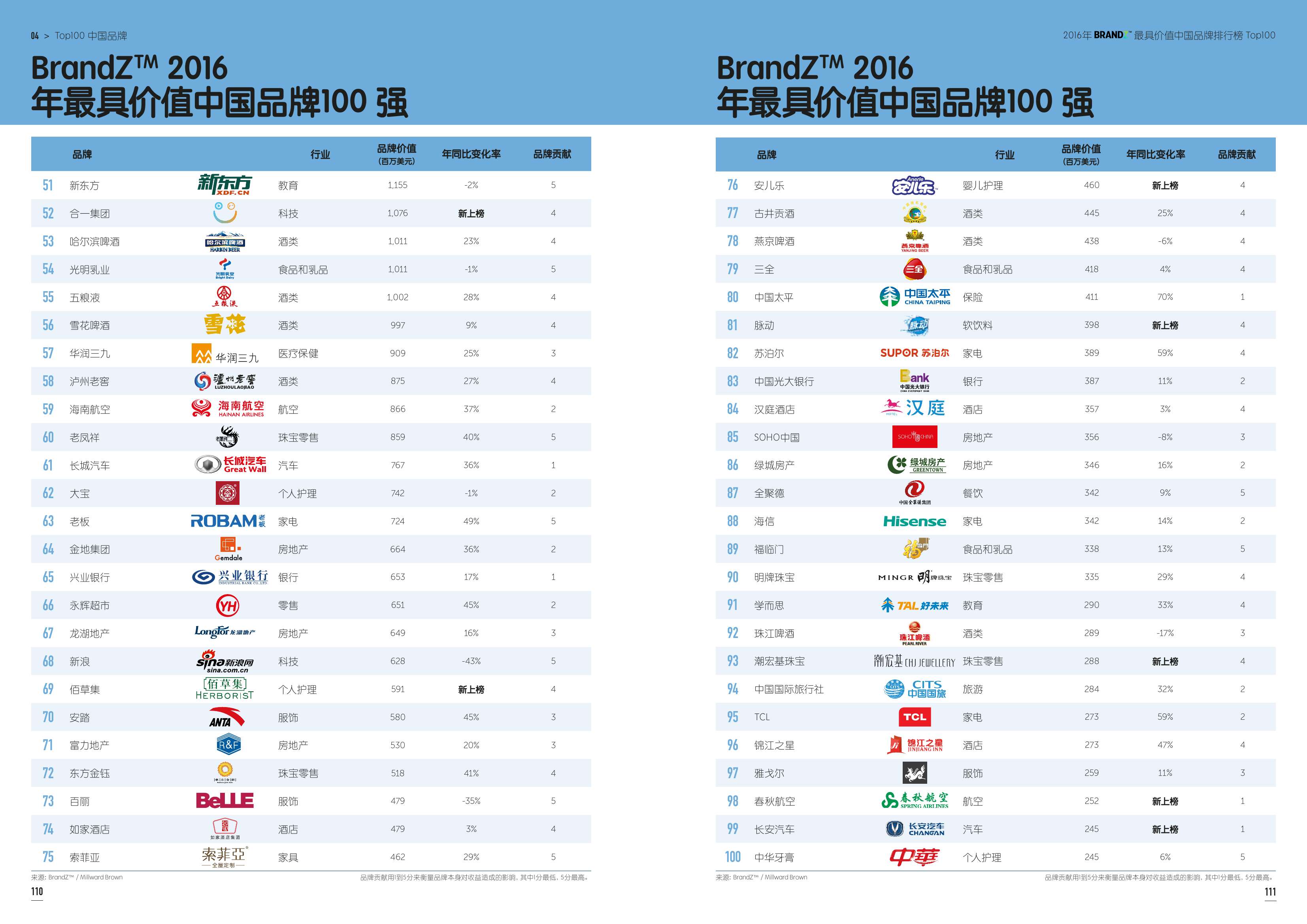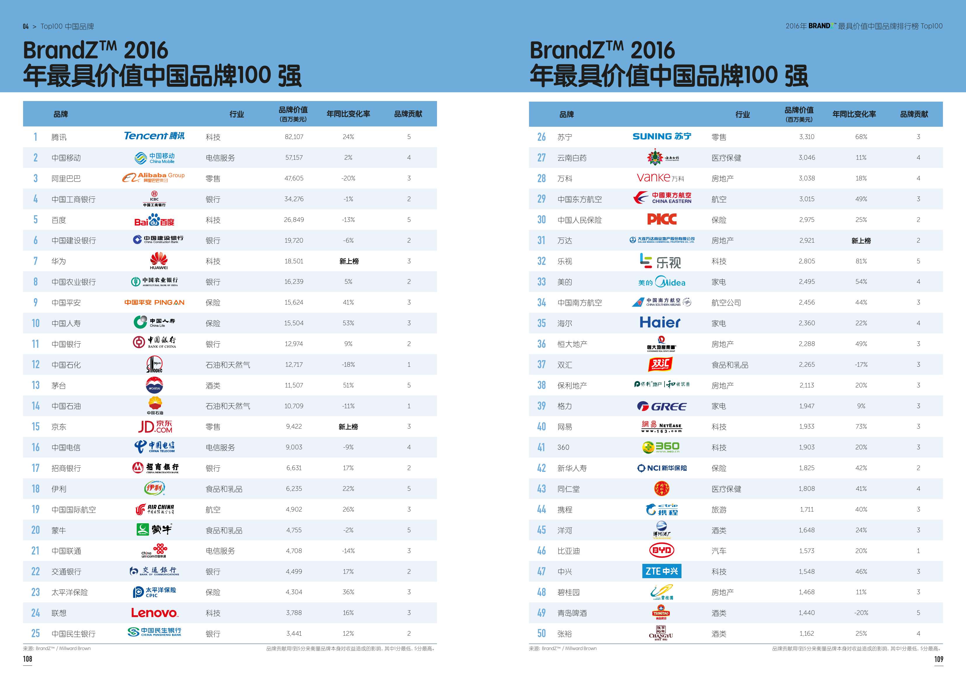 BrandZ™:2016年最具价值中国品牌100强排行榜 更多阅读:BrandZ:2016年最具价值中国品牌100强(附完整版下载)BrandZ:2016年百强品牌之新上榜品牌BrandZ:2013年最具价值中国品牌50强BrandZ:2012年亚洲最具价值品牌 科技品牌百度排名第一Millward Brown:2015年BrandZ最具价值全球品牌100强排行榜BrandZ:2015年最具价值中国品牌榜Top100Millward Brown:2012年“BrandZ最具价值全球化品牌100强谷歌&凯度:2023年中国全球化品牌50强 比亚迪进入前十Millward Brown:2012年BrandZ全球品牌价值榜(下)Millward Brown:2012年BrandZ全球品牌价值榜(上)CCFA:2019年中国超市百强Demand Gen :制造商将数字转换扩展到销售和营销报告数字之旅的时代启幕——空间计算中电联:2021中国电力行业年度发展前程无忧:2021年Q1集成电路/半导体市场供需报告