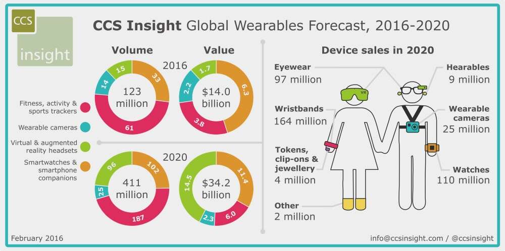 CCS Insight 展望了穿戴技术方面的未来,表明2020年将售出4.11亿套智能穿戴设备,价值高达340亿美元。