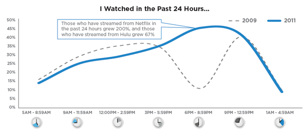 2012年用户在晚上6点到9点观看网络视频的比2009年增加了30个百分点,而在商业时间(9AM-5PM)的视频观看用户比例则减少了,用户观看网络视频多在家中。像Netflix和Hulu这样的服务(两者都同比2009年翻了一番)推动了夜晚视频观看量的增长