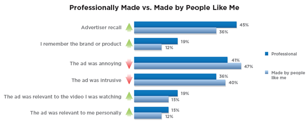当视频广告和专业视频内容结合在一起时,视频广告的接受度提升了。我们发现,对于专业视频,用户更可能记得看过广告,记住产品信息或回忆起看到的品牌。和专业内容在一起的视频广告也更可能被用户认为和自己有关。