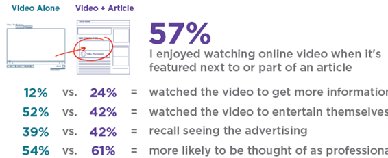 当视频内容与其他媒体混合一起时,用户的沉浸度更高了。他们对于包含在内容中的视频中看到的广告的接受度也变得更高。57%的用户表示他们喜欢观看和文章内容一起的视频内容,我们也发现当用户观看包含在文章页面中的视频时,他们观看这些视频以获取更多的信息,他们回忆起看到过广告,认为这个视频是专业的比例也更高。显示出在内容环境中,用户对视频广告的接受度更高。
