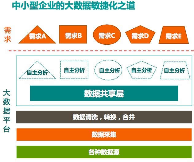 因此,在企业建立大数据中心之初,就要避免单纯将数据整合到一起而不加以有效的管理。对于中小企业,大数据的敏捷化之道就是场景化驱动。一定要围绕企业最根本的业务需求,而不是为了大数据而大数据,不是说因为Hadoop火,我就一定要使用Hadoop。中小企业需要更灵活、更快速、更高性价比的解决方案。