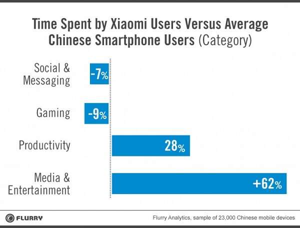 应用类型方面,Flurry发现,小米用户多是媒体和娱乐类app的重度用户,比平均值高出了62个百分点。