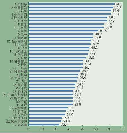 据王军介绍:新加坡、中国香港、韩国和中国台湾依然占据排名的前四名;日本和以色列分别排名第五和第八;中国今年排名第九,与2014年相同。