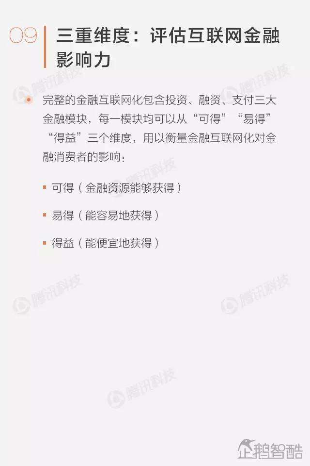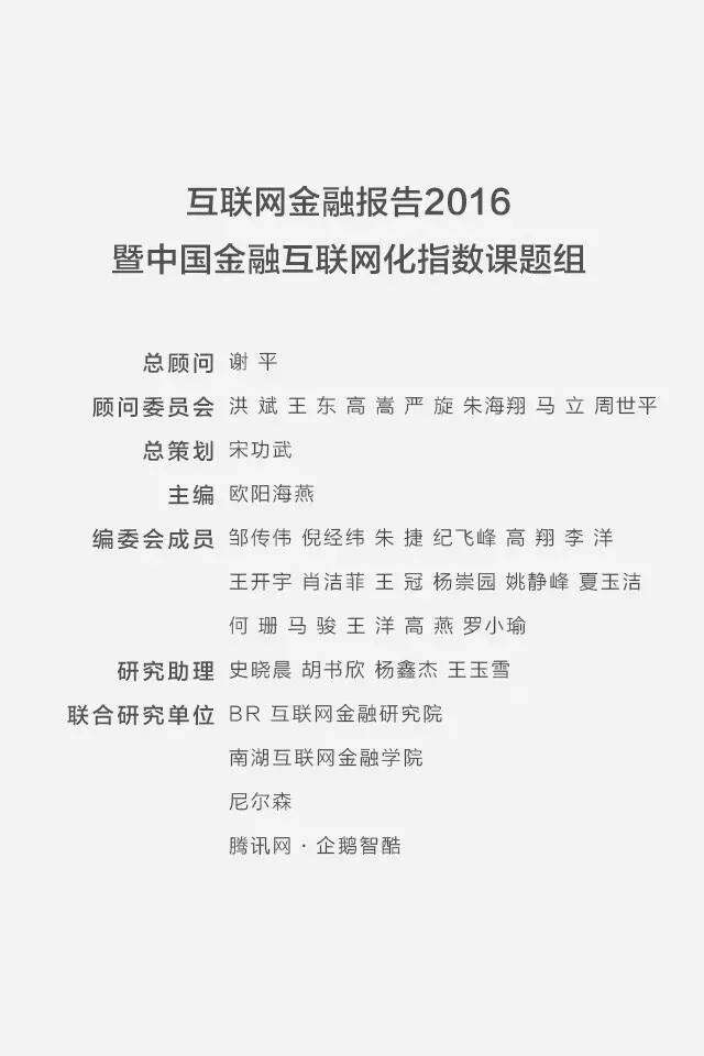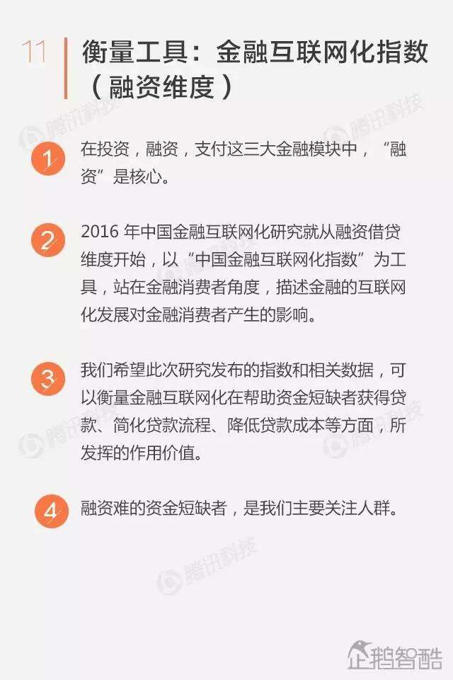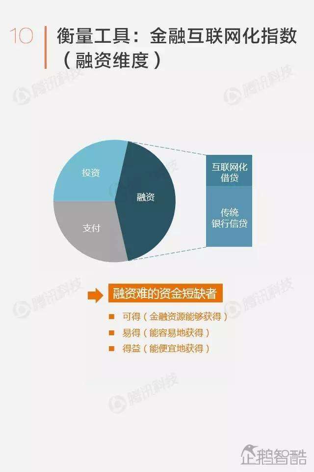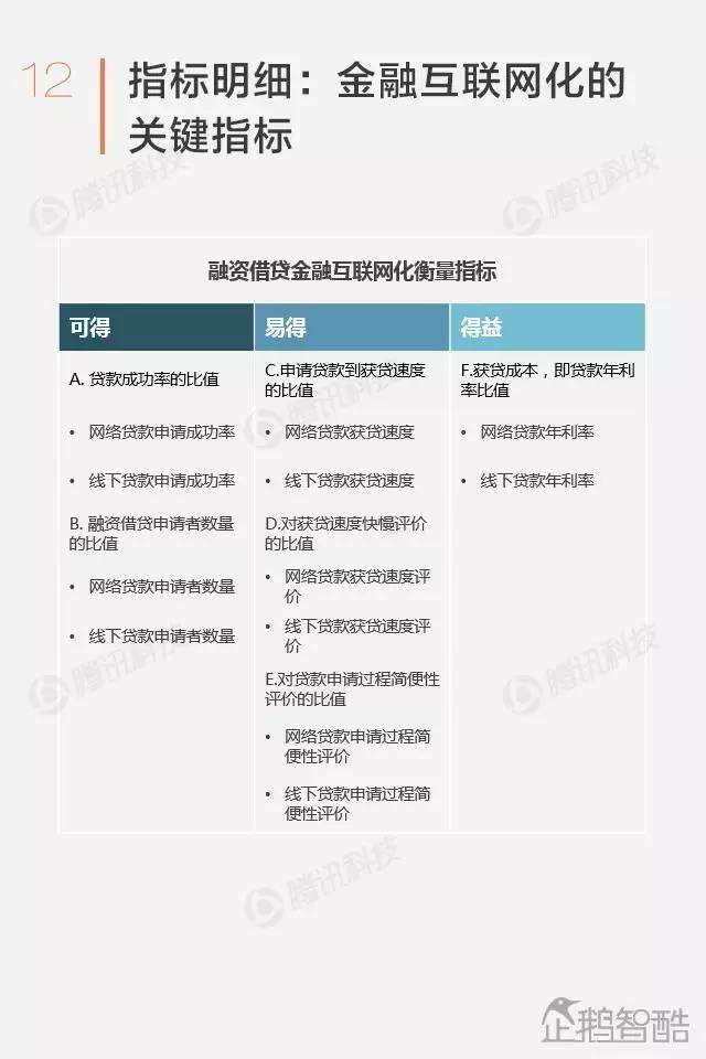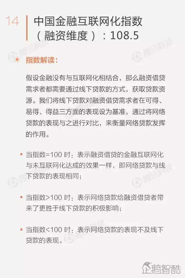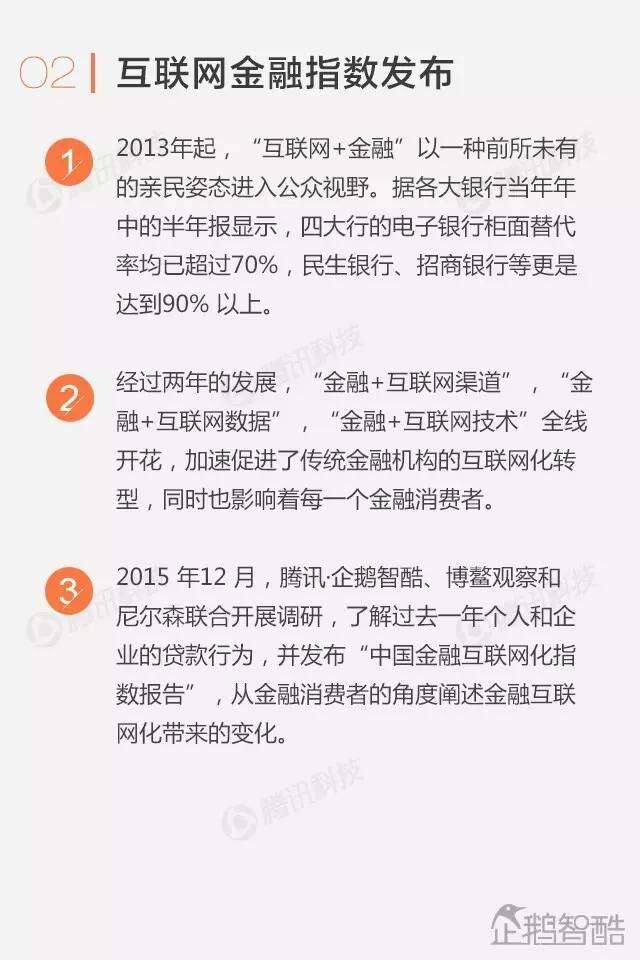 企鹅智酷:2016年中国互联网金融指数报告 在今年的博鳌亚洲论坛上,企鹅智酷、尼尔森、论坛官方杂志《博鳌观察》三方联合发布《中国金融互联网化指数报告》。 该指数站在金融消费者角度,从可得、易得、得益三个维度,去衡量金融的互联网化发展对金融消费者产生的影响。 2016 年首次发布的融资维度的中国金融互联网指数为108.5,这表明现阶段网络贷款已经给融资借贷需求者带来了积极影响,金融互联网化的成效已初步体现。 未来,报告课题组将对中国金融互联网化保持长期关注研究,并周期性更新中国金融互联网化指数。 以下为报告正文: 更多阅读:企鹅智酷:2016年微信影响力报告微金所:2014年12月信贷市场利率指数企鹅智酷:2017中国网络视频直播行业趋势报告企鹅智酷:2018年中国电竞运动行业发展报告企鹅智酷:抖音&快手用户研究报告2018年的中国消费者:全球品牌中国影响力指数首发企鹅智酷:2018中国在线综艺用户洞察报告企鹅智酷:2017中国电竞发展报告企鹅智酷:“解剖”95后——私享未来10年消费红利报告企鹅智酷:中国三四五线城市网民时间&金钱消费数据报告支付宝:2025年余额宝累计收益超5000亿元Henley&Partners:2024年亨利全球护照指数排名苏宁金融研究院:2020年一季报互联网金融行业携程:2020目的地复苏指数报告中国汽车流通协会:2019年10月份中国二手车经理人指数为51.6%