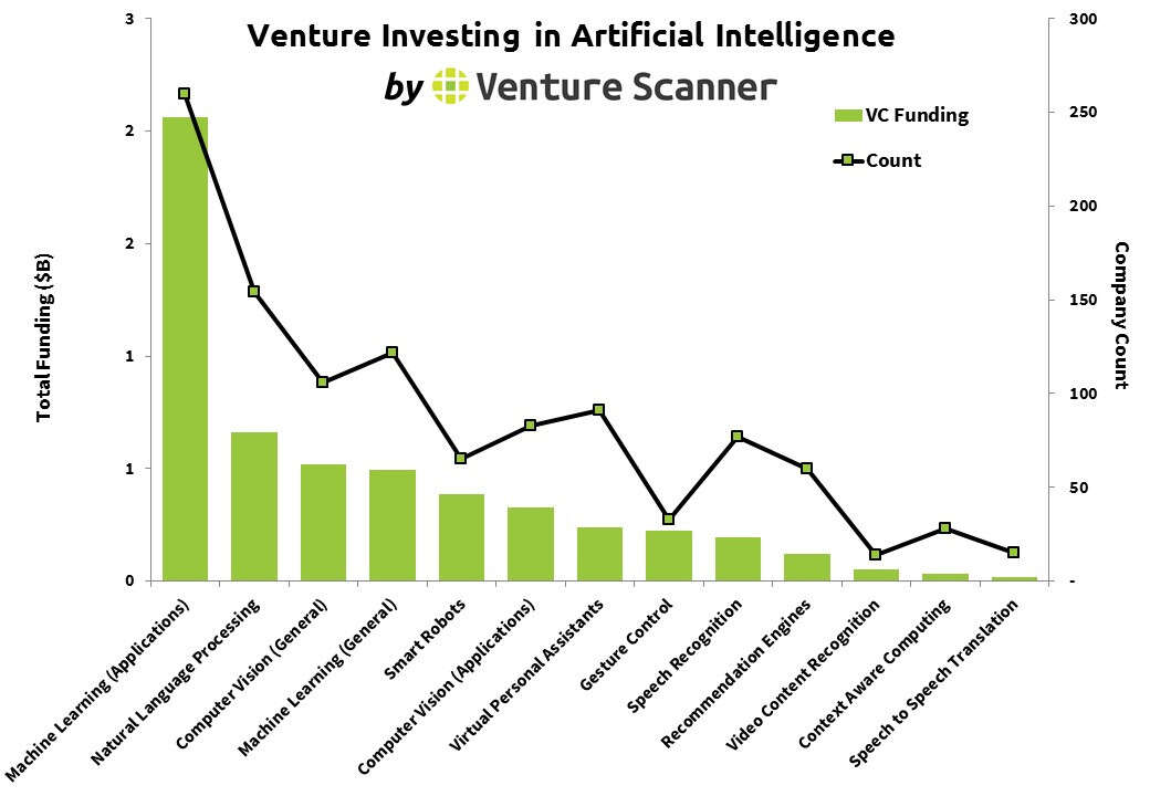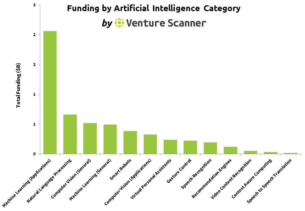 Venture Scanner对跨越13个种类,总计957家人工智能公司进行了追踪分析。这些公司的总共融资金额高达48亿美金。下面的15张可视化图片总结了人工智能行业目前的状态。