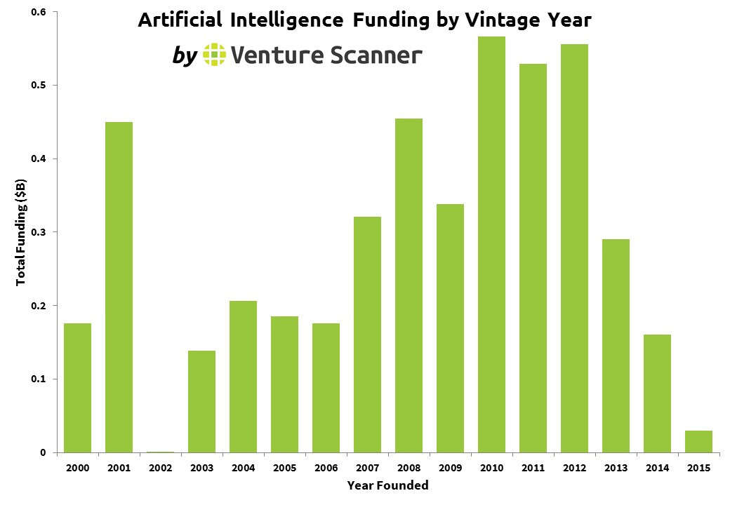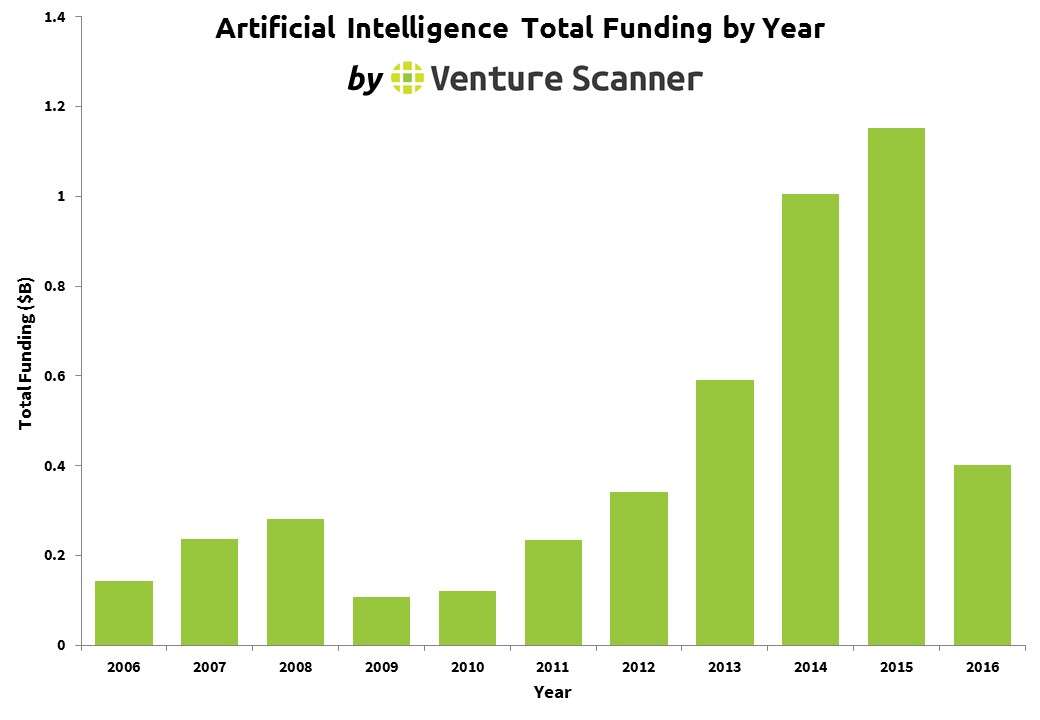 图表列出了每一年人工智能公司所获取的总资金数量。2015年是人工智能的大丰收年,有着12亿美金的总资金量,2014年获得10亿美金融资位居第二。