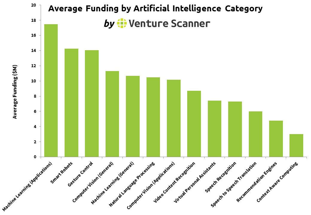 上图是每一类人工智能公司的平均融资额。机器学习(应用)类以平均每家公司1700万美金的资金量占据第一,智能机器人与智能控制类公司以1400万美金跟随其后。