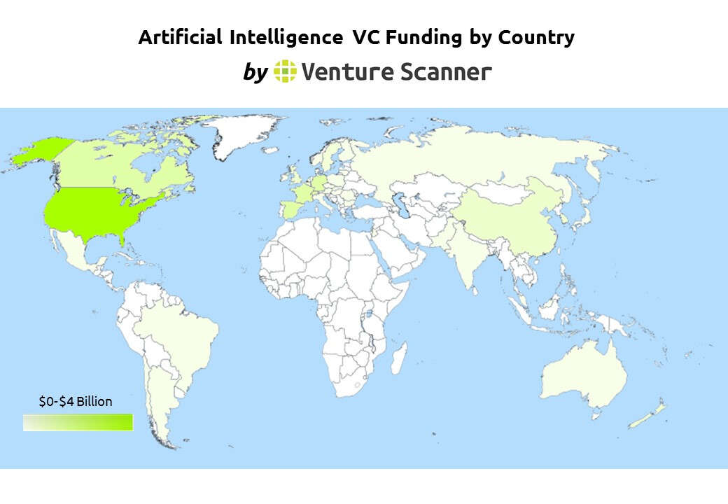 这张地图显示了不同国家对人工智能行业的风险投资额。美国最多,有着42亿美金的风险投资额。瑞士则以2.34亿美金位居第二。