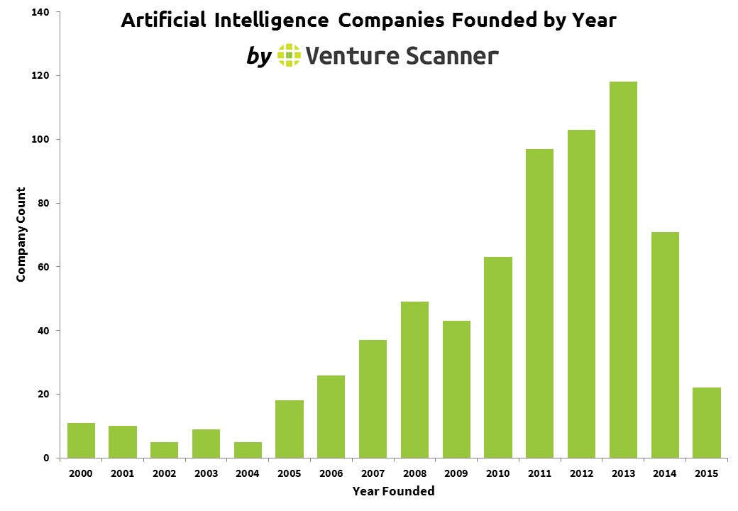 上图统计了每一年新创立的人工智能公司数量。2013年有118家公司创立,排名第一,2012年以103家的数量排行第二。
