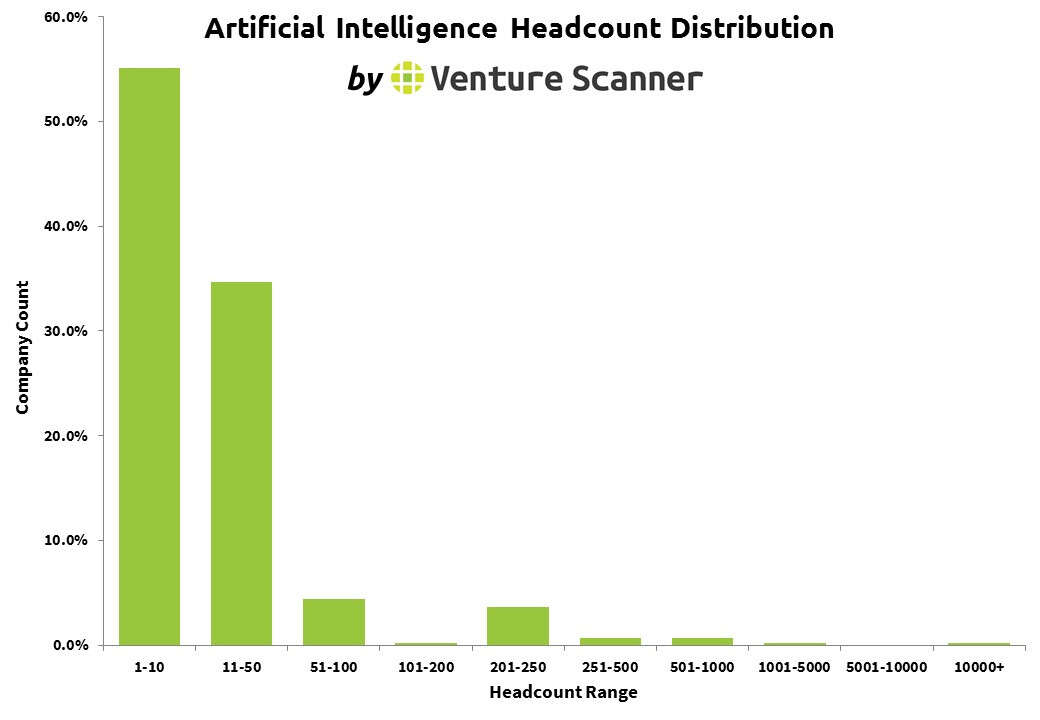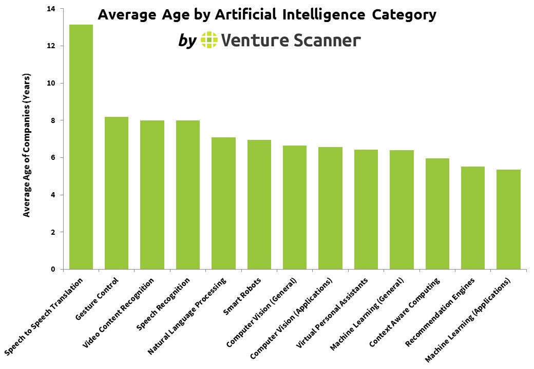 上图给出了不同类别中公司的平均年龄。语音翻译类公司以平均13年的年龄成为最成熟的人工智能细分类别,是接下来三个平均年龄为8年的人工智能分类(手势控制、视频内容识别和语音识别)的1.5倍。