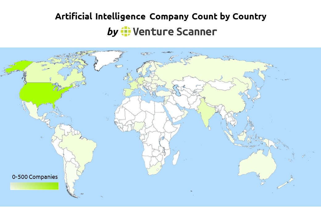 上面这张地图展示了不同国家拥有的人工智能公司数量。美国以499家人工智能公司位列第一,英国则以60家排行第二。