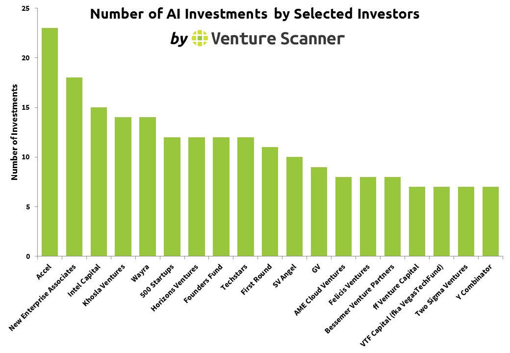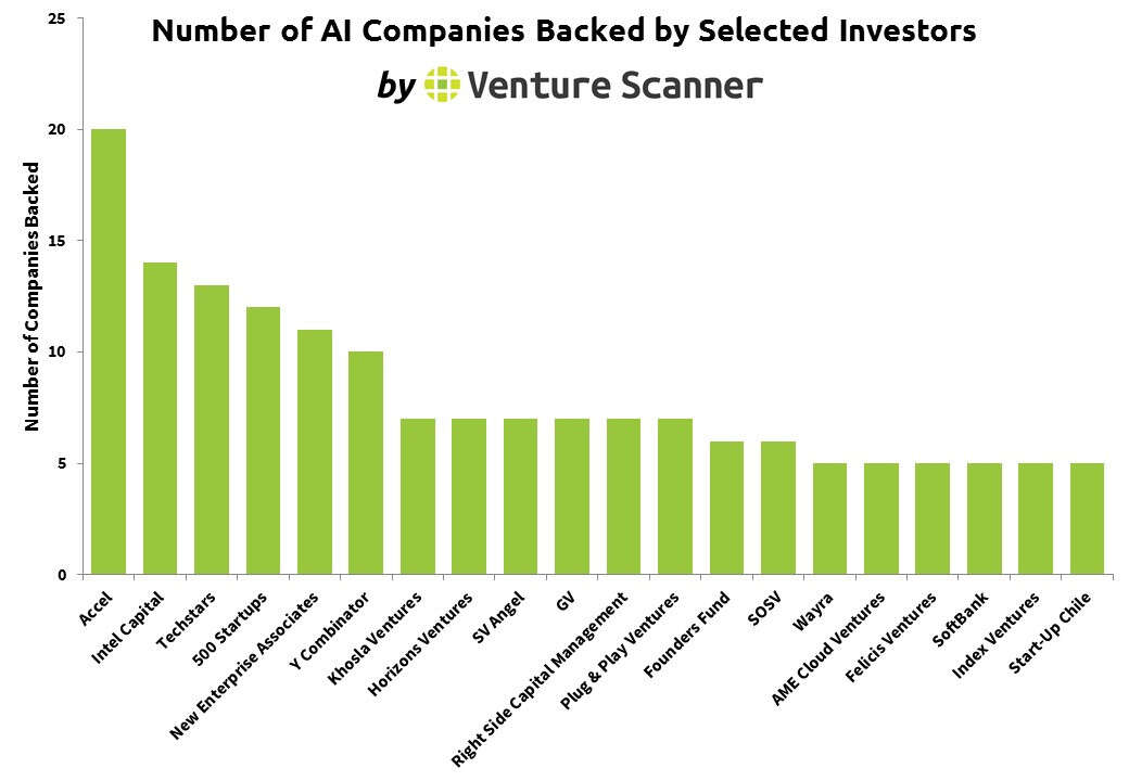 图表统计了多家投资机构所投资的人工智能公司数量。Accel再次以总计投资了20家人工智能公司占据第一,大约是第二名Intel Capital(14家公司)的1.5倍。