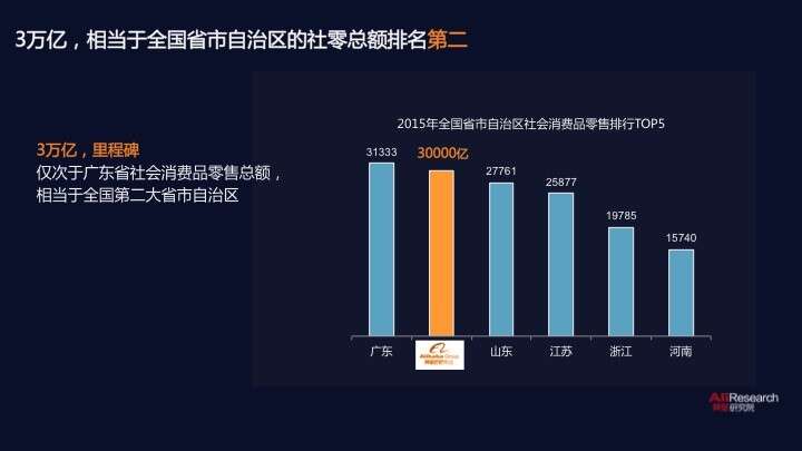 3月21日,阿里巴巴集团2016财年电商交易额(GMV)突破3万亿元人民币。阿里巴巴集团副总裁、阿里研究院院长高红冰发表了题为《从3万亿,看新商业、新生态》的演讲。如果把3万亿跟线下的社会商品零售总额比较,它仅次于广东省的社会消费品零售总额,相当于全国第二大省市自治区。