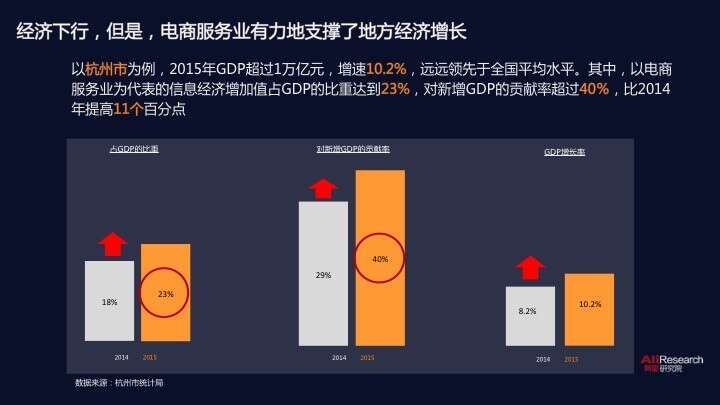此外,电商服务业有力地支撑着地方经济的发展,以杭州市为例,2015年以电商服务为代表的信息经济对新增GDP的增长贡献度超过40%。如果没有电商服务业的快速发展,2015年杭州的GDP增速可能就达不到10.2%。