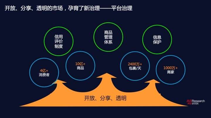 在整个开放、分享、透明的市场背后,带来一个很大的价值,就是产生了新的治理模式—“平台治理”。如假货治理,阿里把数据信息整合以后,提供给供应商、提供给公安,联合他们,一起协作对假货进行打击。这样对线上线下的假货进行治理,联合起来,帮助整个行业和产业升级发展。