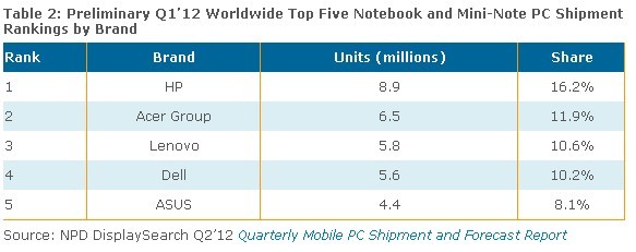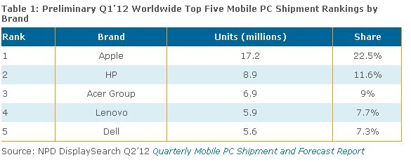 2012年5月22号加利佛尼亚统计数据,移动PC(包括笔记本和平板电脑)份额苹果第一;PC份额(纯笔记本)惠普第一。苹果2012年Q1移动PC出货量1720万台, 比2011年同期出货量增长118% ,该数据来自NPD DisplaySearch 移动PC出货量预测报告。其中80%的苹果移动设备是iPad, 此季度出货量达到了1360万, 比2011年iPad出货量增长了162%。