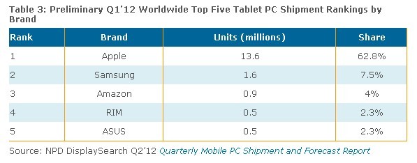 3. 2012年Q1苹果稳居平板电脑市场第一,占2012年Q1 62.8% ,Barnes & Noble从Top 5出局,Amazon从第二跌倒第三,三星重新占据第二,因为在欧洲,中东,非洲的出货增长。黑莓和华硕在上一季度的短暂萎靡后重回Top 5榜单。