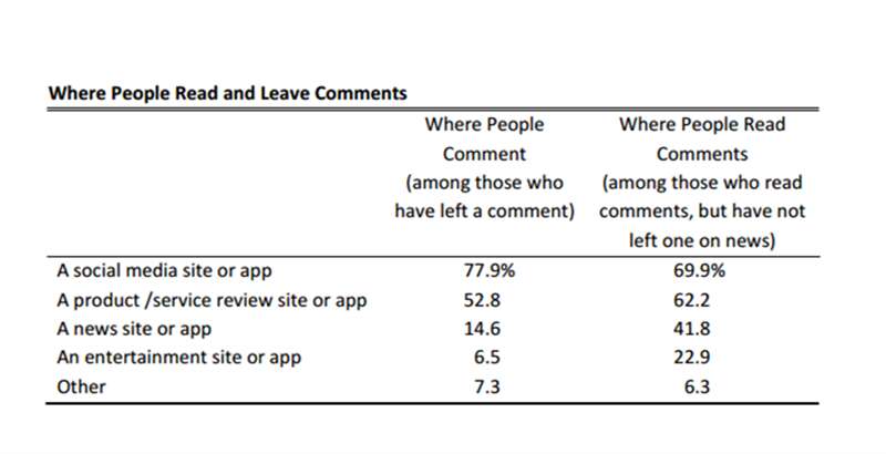 在SXSW (每年在美国得克萨斯州奥斯汀举行的一系列电影、音乐和多媒体交互式的节日) 上,德州大学奥斯汀分校发布了一组关于新闻评论区的调查(Survey of Commenters and Comment Readers),调查对象评论发布者和评论受众。