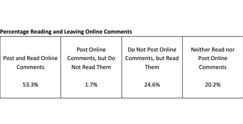 报告显示超过一半的美国人从来不会阅读和新闻事件有关的任何评论内容,无论是新闻客户端、社交网络或是新闻网站上的评论都不会看,只有14%的人有过评论新闻事件的经历。