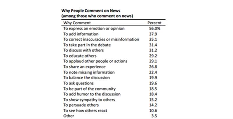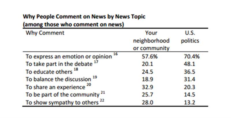 人们参与评论的原因,也与各自平时喜欢谈论的话题有关。比如,那些经常评论自己周边生活事件的人,会分享自己的经历,尽可能融入自己的社群,或者是表达对他人的关切。相比之下,那些经常评论美国政治类新闻的人会倾向于表达情感态度或者观点,有时会引发争论,或者是就某一话题展开讨论。