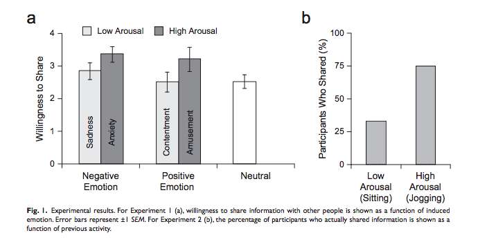 在两侧并排的研究,一些参与者观看了设计,而另一组观看了中间的视频剪辑来激活自己的情绪。在另外一组,一些参与者到位慢跑一分钟,而其他人坐着不动。然后在这两项研究的所有参与者被要求分享预先选定的文章(或简单地把文章分享给他们喜欢的任何人)。