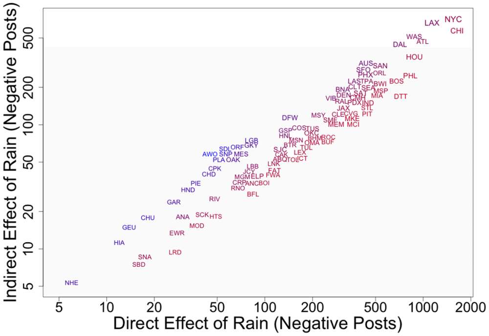 后面的数据就更有趣了,在下雨的情况下,负面的帖子在1.29,而积极的帖子却在1.75.(虽然我不知道作者是怎么得出的,但是从自己的朋友圈,空间看也确实如此)