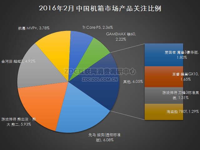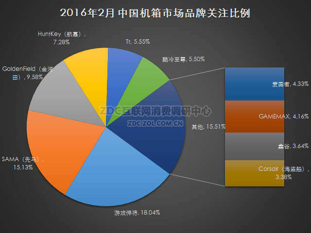 2016年2月中国的机箱市场上品牌竞争十分激烈,游戏悍将、先马和金河田获得前三,他们的市场关注比例分别是18.04%、15.13%和9.58%;航嘉的市场关注比例为7.28%,Tt和酷冷至尊的关注度相近,分别为5.55%和5.50%,其他品牌的市场关注比例都在3.38%-4.33%之间。