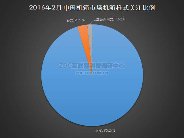 在机箱样式方面,2016年2月中国的机箱市场上,立式机箱为绝对的主流,吸引了95.27%的市场关注比例,卧式机箱的市场关注比例为3.21%,立卧两用式为1.52%。